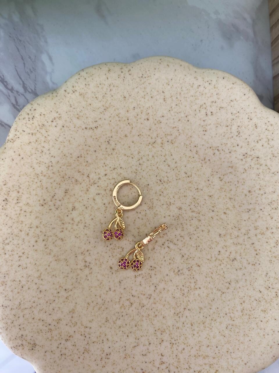 Argollas de oro laminado con dije Cherry con incrustaciones de micro zirconias violetas.